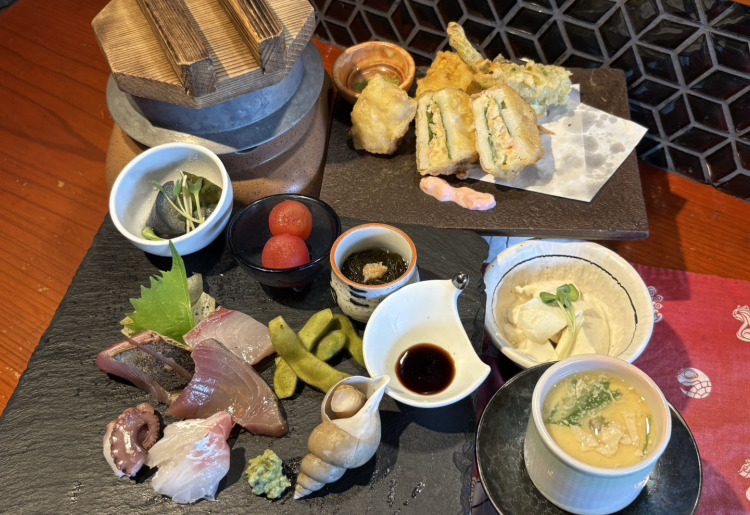美味しいものを少しづつ。自家製豆富・お刺身・天ぷら盛り合せ、そして真鯛の釜飯。