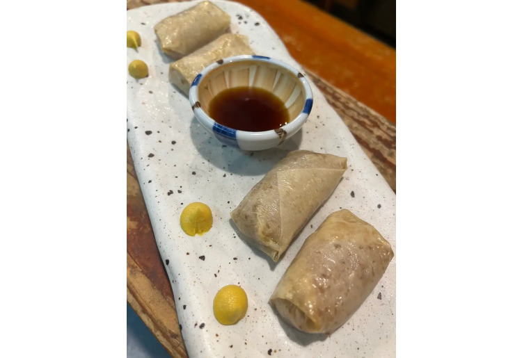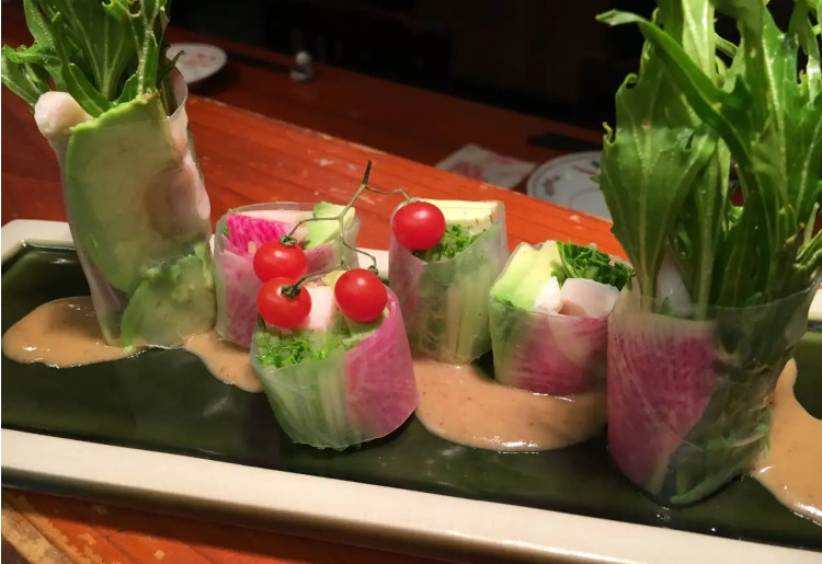 生ハムの塩気とクリーミーな生湯葉ととろりとした完熟アボカドの食感、シャキシャキ水菜を生春巻きにして。