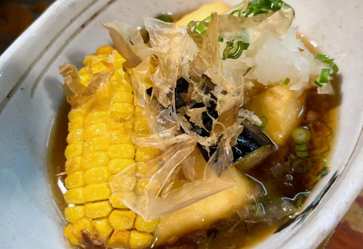 通常揚げ出し豆富は水切りをした豆腐を使って作りますが、五感の揚げ出し豆富は、瑞々しい水分たっぷりの自家製豆富を使用して作っているのでジューシーでさっくりとした仕上がりです。