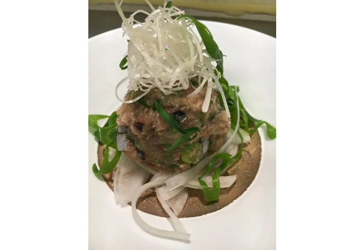 当日入荷のお刺身の様々な端肉をお味噌・生姜・たっぷりの薬味でたたきあわせて作ります。