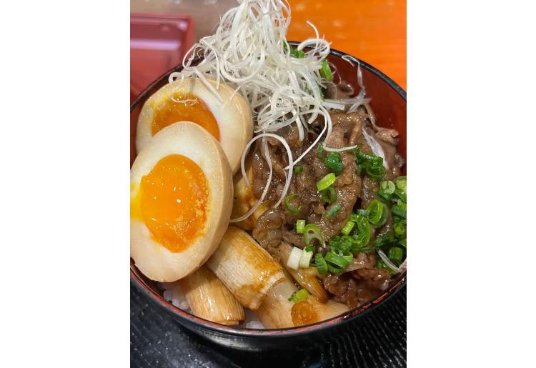 たっぷりの黒毛和牛のロース肉を甘辛いタレで柔らかくサッと火を通し、半熟煮玉子を一緒に!赤出汁のお味噌汁付きです。